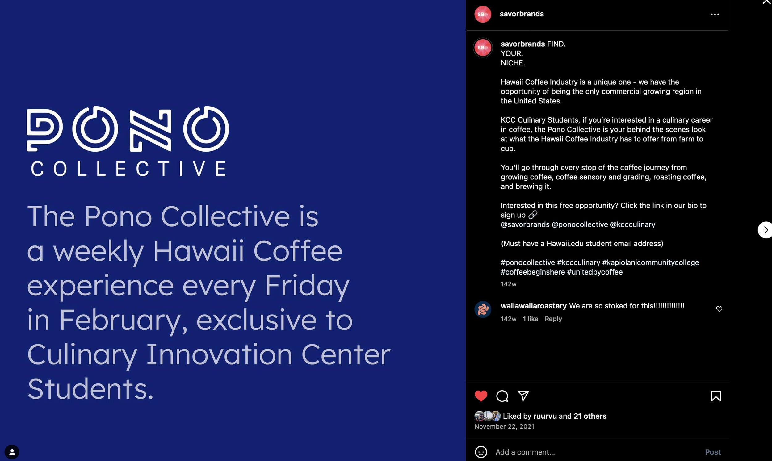 This was short, to the point, and really highlighted the impact that this program would have when you attended. We used the new feature at the time, Collaboration Tags, with KCC Culinary on our main Savor Brands Instagram account (PonoCollective was later created and introduced after we grew the main concept). We utilized the strength of the hashtag #kccculinary to capture more impressions and entice students who see it to sign up.
